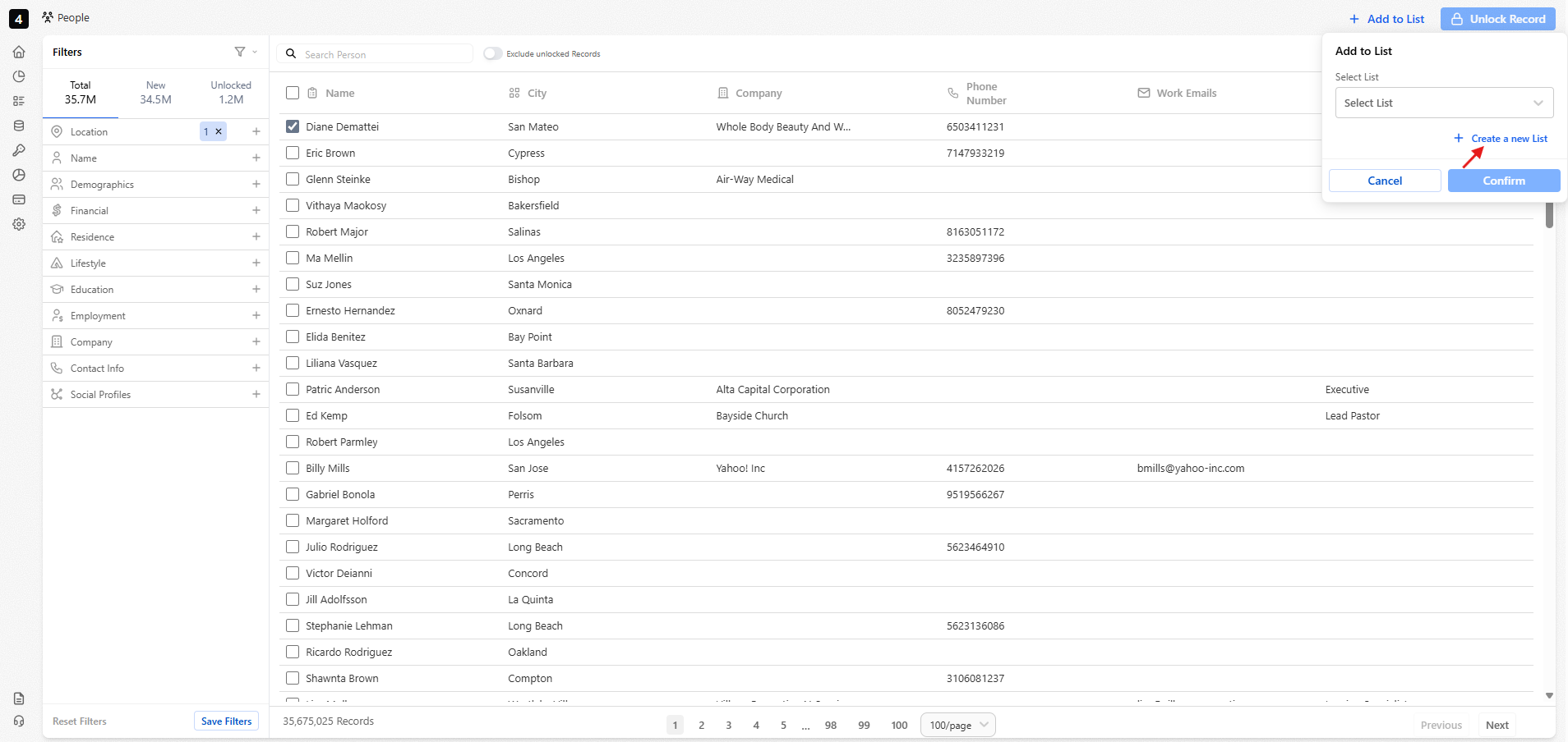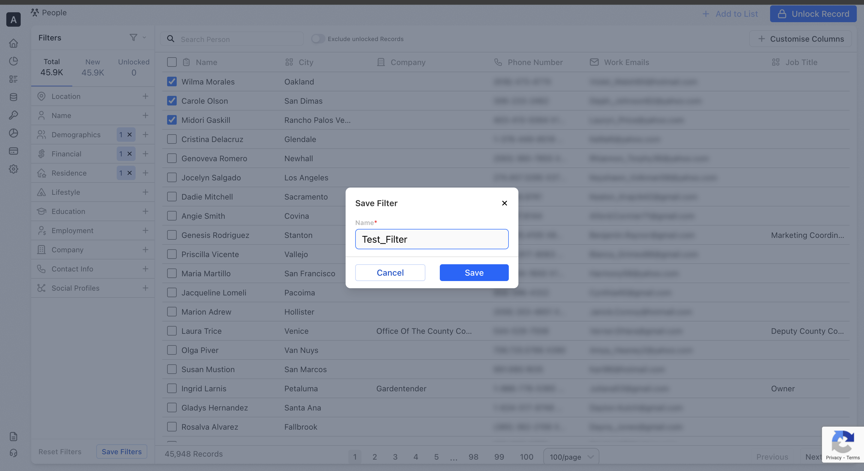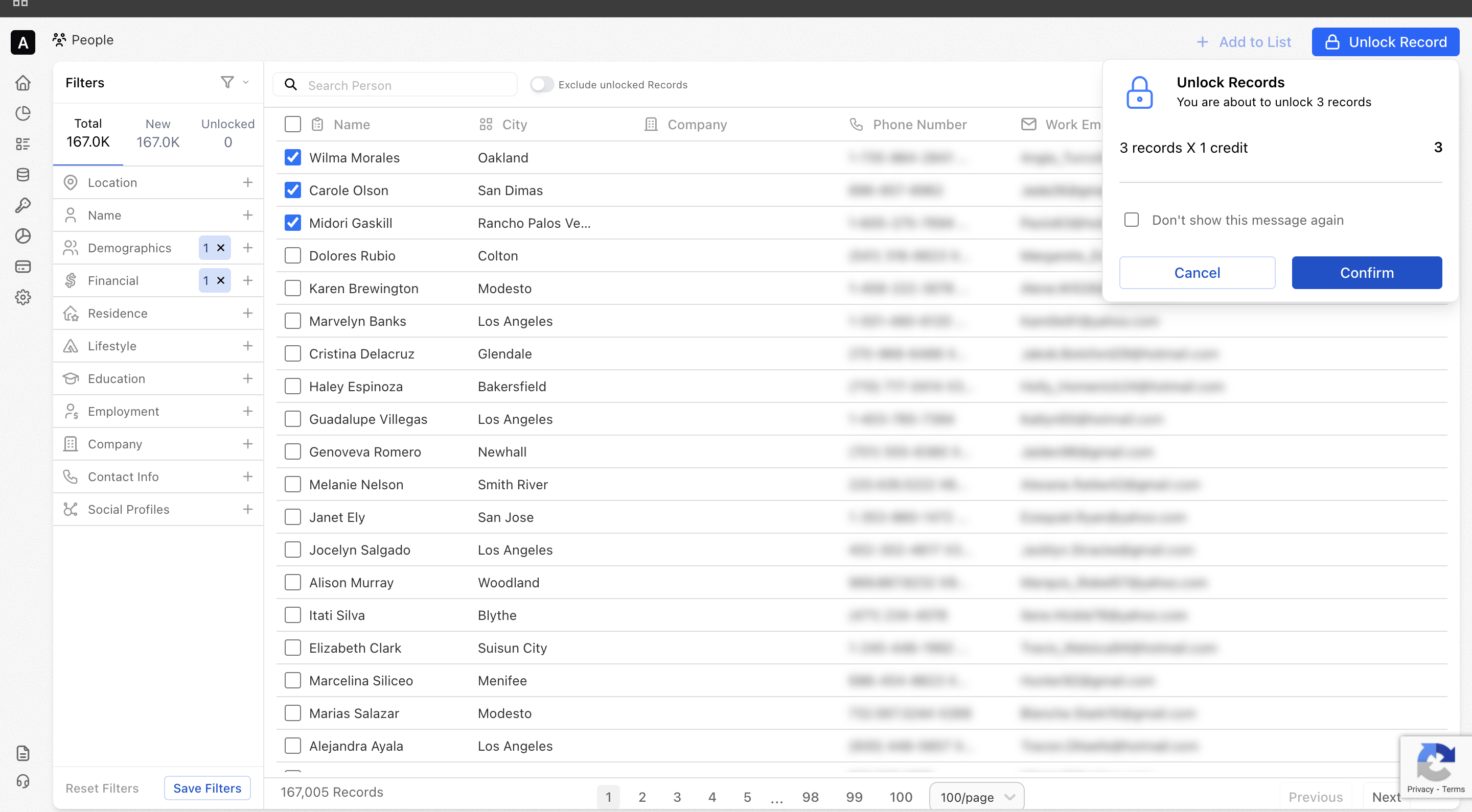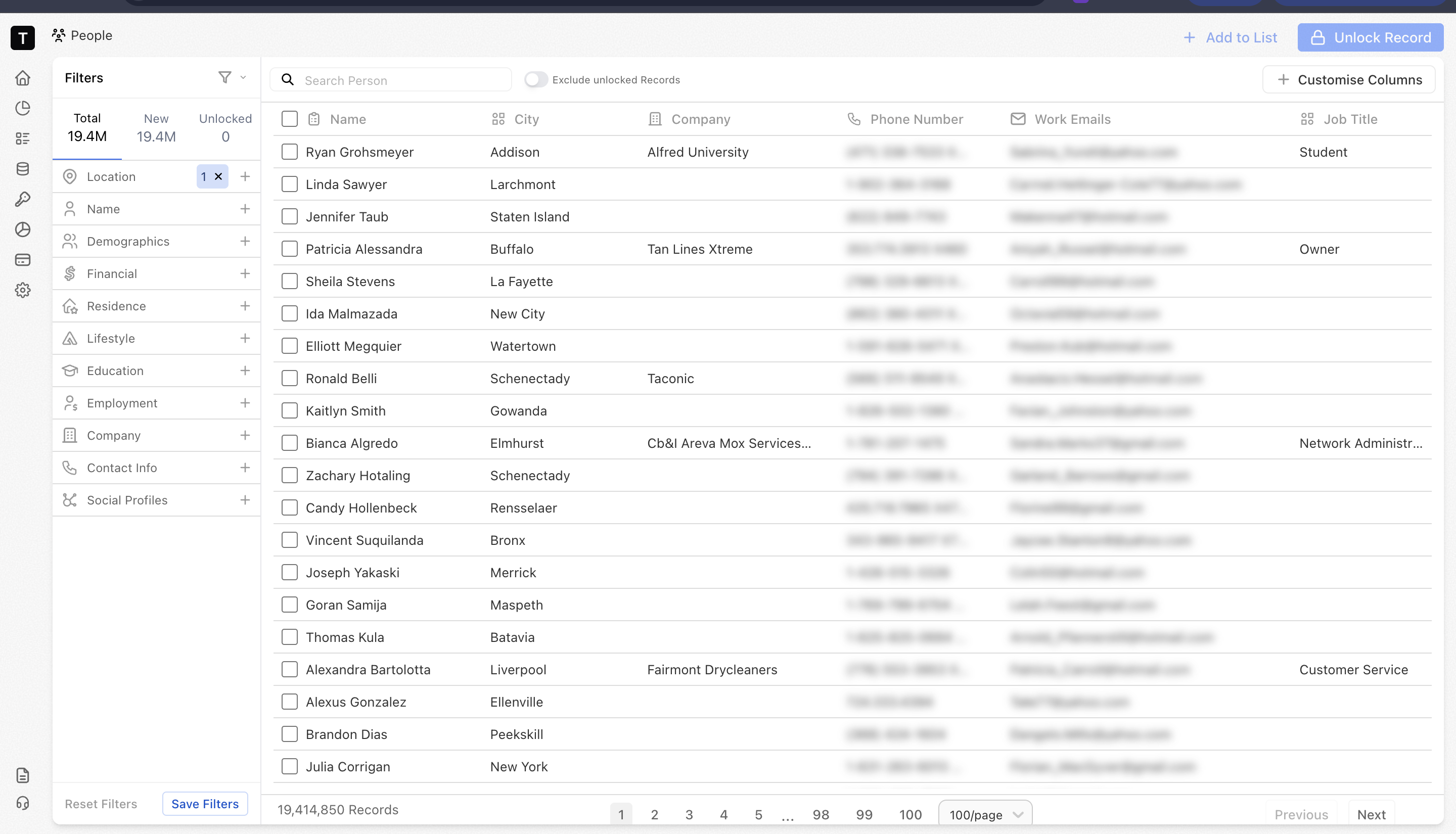 You can unlock people's records when you’re ready to access full details, giving you full control over when and how you use your credits. By combining multiple filters, you can narrow down your audience and unlock only the records that best match your requirements.